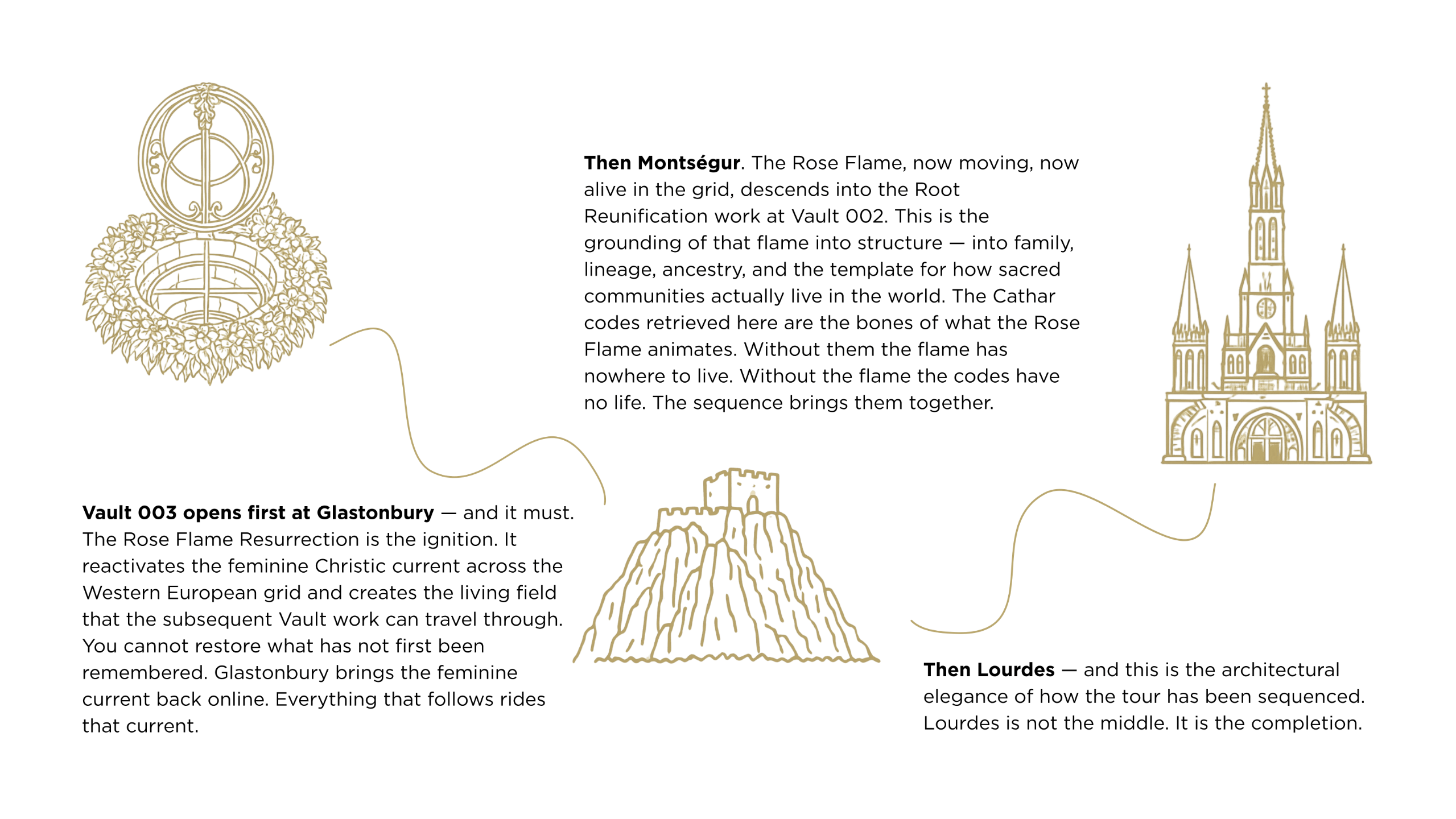 This is also why the tour ends in Lourdes with celebration. Because by that point it is genuinely complete. Not as a ceremony that has concluded — but as a sequence that has fully landed. The mission closes in water. In the oldest tradition of the mystery schools, that is always the right place to close.