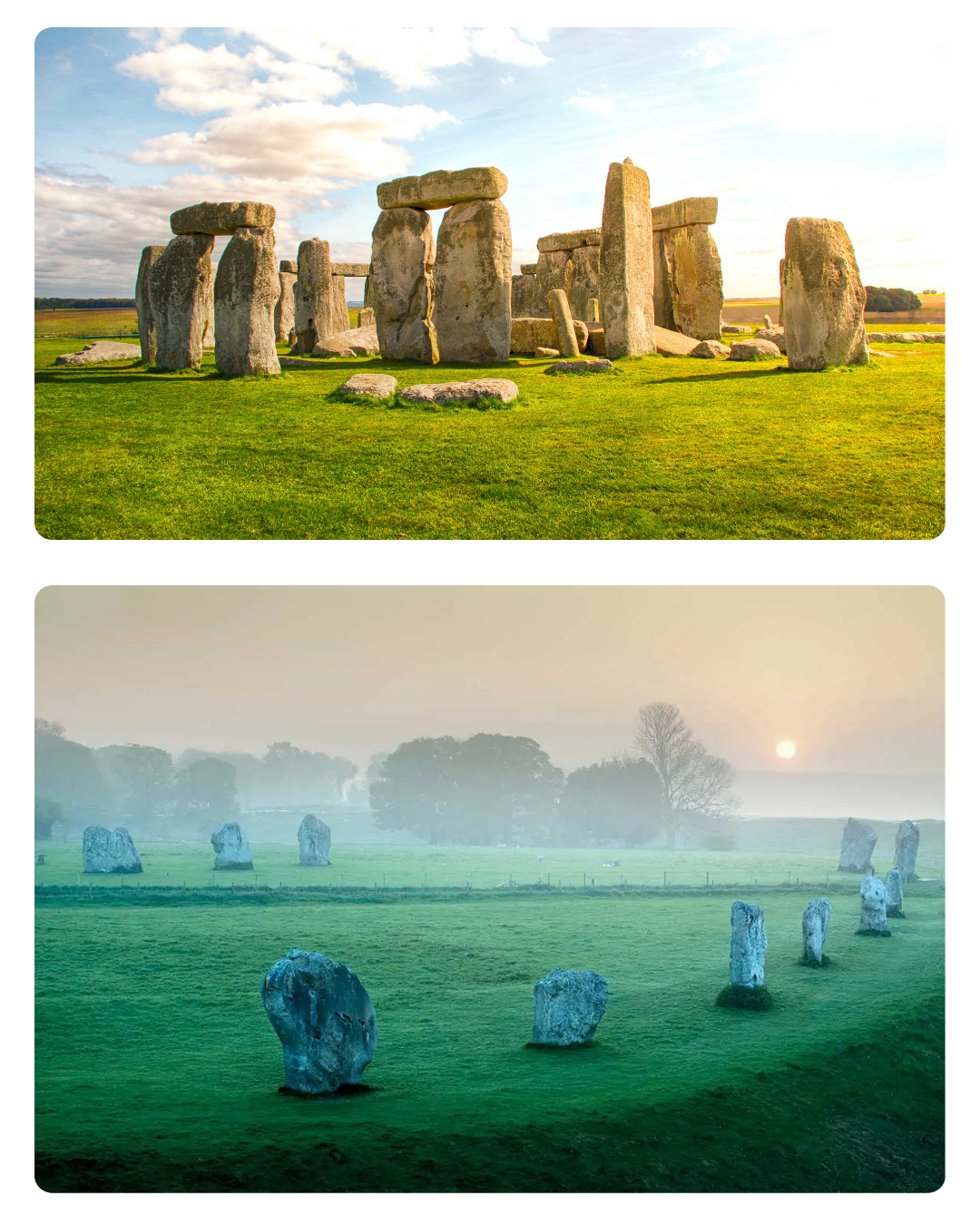 Avebury is the larger stone circle complex — older than Stonehenge, less touristed, and energetically more intact. Ceremonial walking, earth communion, and deeper integration happen here. The land breathes differently at Avebury.